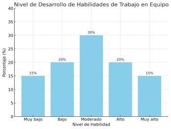 La muestra de 40 estudiantes de la Universidad Politécnica Salesiana Sede Guayaquil proporciona valiosas perspectivas sobre el desarrollo de habilidades de trabajo en equipo en contextos virtuales. Sobre el nivel de habilidades de trabajo en equipo, como se aprecia en la figura 1, un 30% de los estudiantes reportó un nivel 'Moderado', lo que indica una competencia adecuada pero mejorable en el trabajo en equipo. Contrastando, un 15% percibió sus habilidades como 'Bajas', sugiriendo áreas significativas de mejora o falta de experiencia en entornos colaborativos en línea. Esta diversidad en los niveles de habilidad señala hacia una experiencia variada y multifacética en el trabajo en equipo entre los estudiantes, posiblemente influenciada por factores como diferencias individuales, experiencias previas y la efectividad de las estrategias pedagógicas empleadas