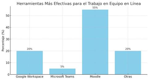 Los resultados reflejan la prevalencia de plataformas como Moodle y Google Workspace, lo que se alinea con la literatura que destaca la importancia de estas herramientas en la educación en línea (Parra et al., 2022). Sin embargo, es interesante observar que Microsoft Teams tiene una presencia limitada entre los estudiantes. Esto podría estar relacionado con la adopción y preferencia de plataformas específicas por parte de la Institución. En cuanto a las actividades o recursos más efectivos para el trabajo en equipo en línea, la mayoría de los estudiantes mencionó los proyectos colaborativos en línea, lo que concuerda con la literatura que resalta la eficacia de los proyectos colaborativos en la promoción de habilidades de trabajo en equipo (Rojas López, 2021)