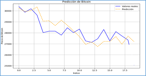 Así, fue posible ejecutar el modelo con los datos de entrenamiento (40%) y se validó con los datos de prueba (60%), y evaluar el rendimiento del modelo calculando la pérdida en los datos de prueba. Finalmente, se desnormalizaron las predicciones para obtener los valores reales del precio de Bitcoin.